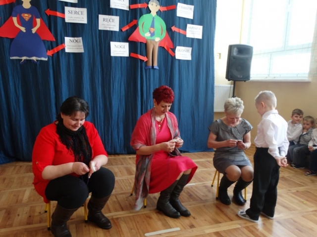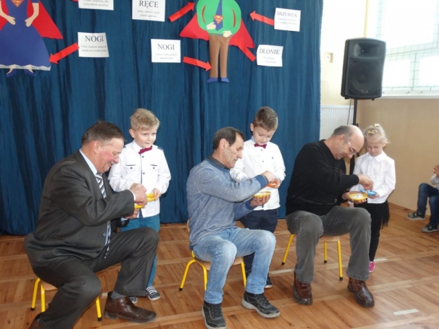 Nie był to jednak koniec atrakcji przewidzianych na ten dzień, drugą część uroczystości stanowiły konkursy dla babć i dziadków. W trakcie konkurencji uczestnicy musieli wykazać się różnymi umiejętnościami podczas ubierania wnuczka, przyszywania guzika, oddzielania grochu od fasoli czy wiązania krawatu. Żadna z konkurencji nie sprawiła uczestnikom problemu. Wszyscy poradzili sobie doskonale, każdy otrzymał specjalną nagrodę- całusy od swoich wnucząt. Przez kilka godzin w miłej atmosferze i przy słodkim poczęstunku, przygotowanym przez rodziców dzieci z Punktu Przedszkolnego, klas 0 i I, mieliśmy przyjemność gościć w naszej szkole takich wyjątkowych gości. To był dzień, pełen uśmiechu i radości. Serdecznie dziękujemy szanownym gościom za liczne przybycie oraz rodzicom za pomoc w przygotowaniach.