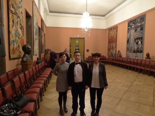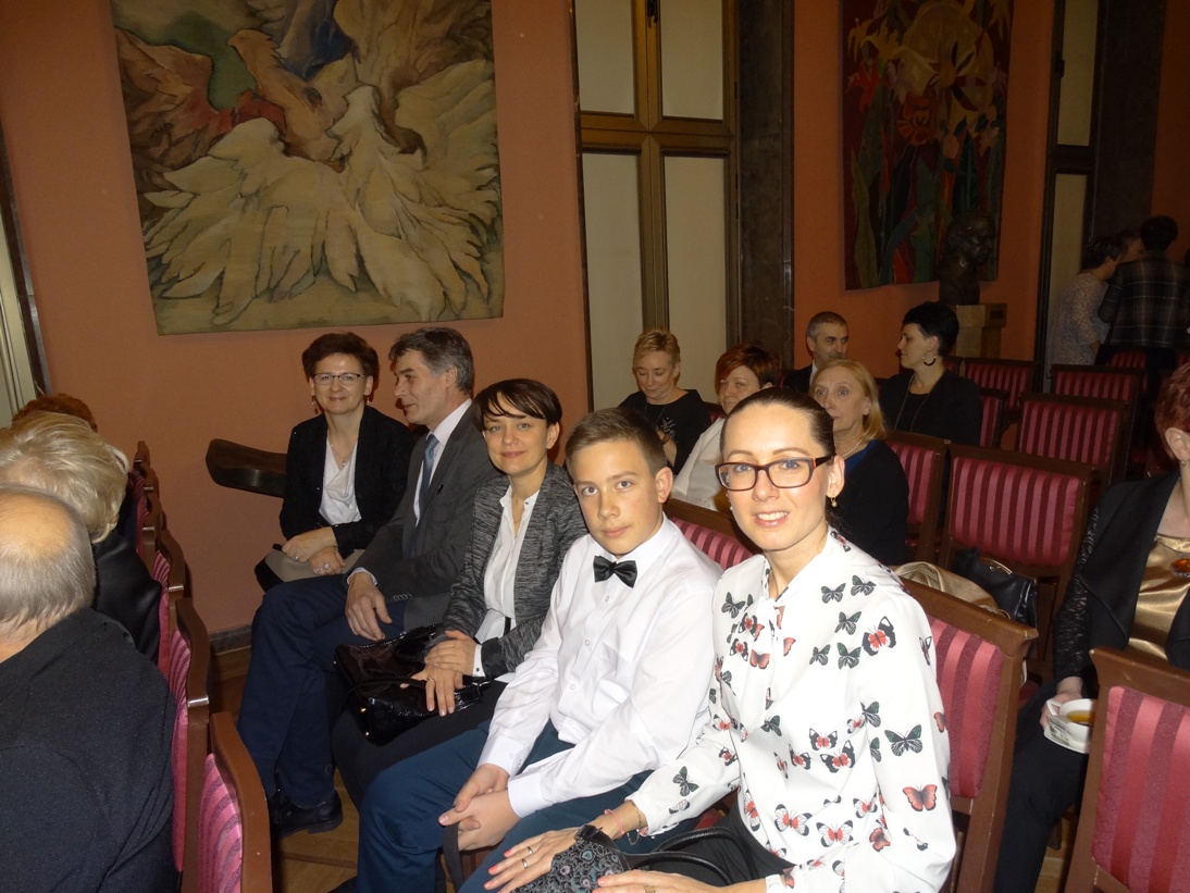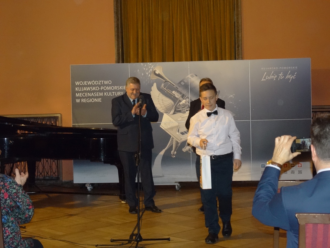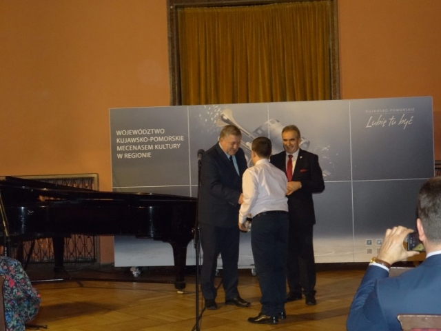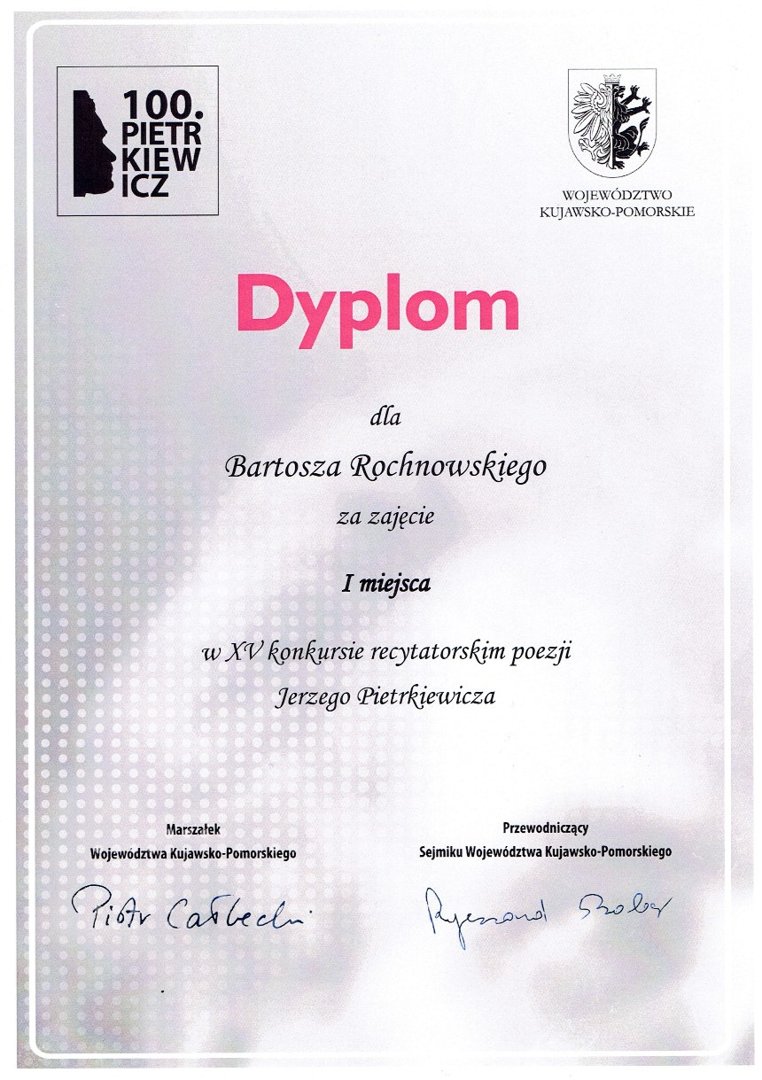 Uczeń naszej szkoły Bartek Rochnowski wziął udział w uroczystości zakończenia wojewódzkich obchodów 100. rocznicy urodzin Jerzego Pietrkiewicza, która odbyła się 9 grudnia w Filharmonii Pomorskiej w Bydgoszczy. Spotkanie rozpoczęło podsumowanie konkursów związanych z osoba poety i prozaika, współorganizowanych przez Urząd Marszałkowski. Bartek oraz inni laureaci otrzymali nagrody, jednak tylko zdobywcy pierwszych miejsc w konkursie recytatorskim mieli zaszczyt zaprezentować przygotowane utwory Jerzego Pietrkiewicza przed tak znakomitym gremium. Było to ogromne wyróżnienie. Atmosfera miejsca oraz goście, osobiście znający Poetę, jego wielcy przyjaciele, tworzyli niezwykły klimat, w którym fragment powieści ,,Sznur z węzłami” przygotowany przez Bartka wybrzmiał doskonale. Jego interpretacja wzbudziła po raz kolejny uznanie i gratulacje słuchaczy.