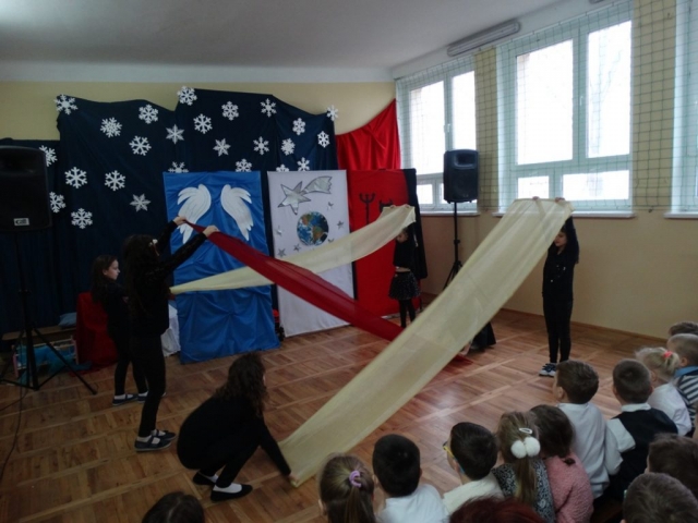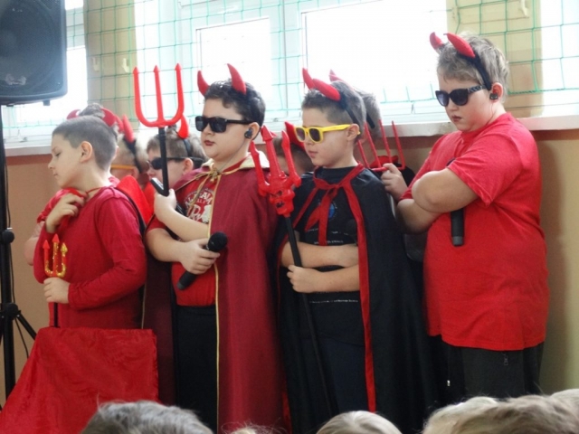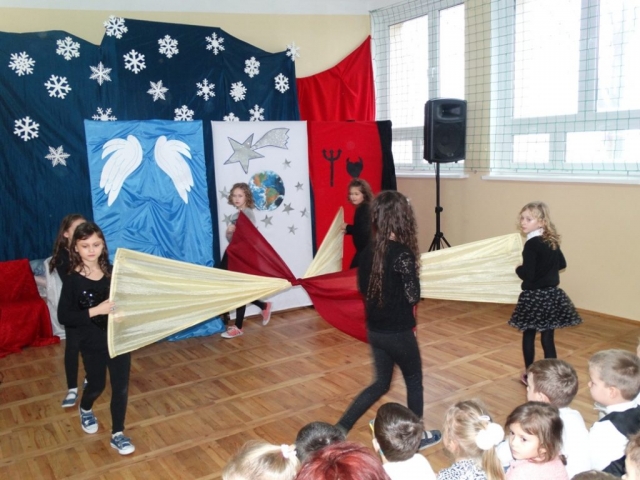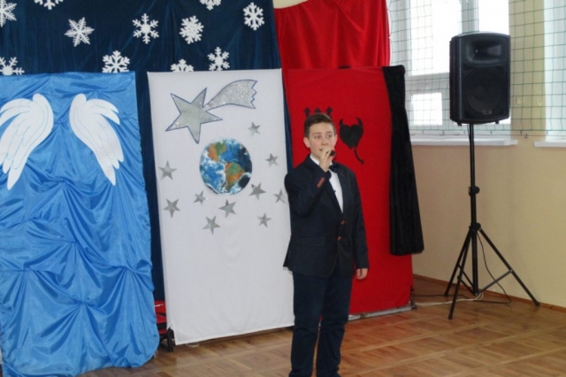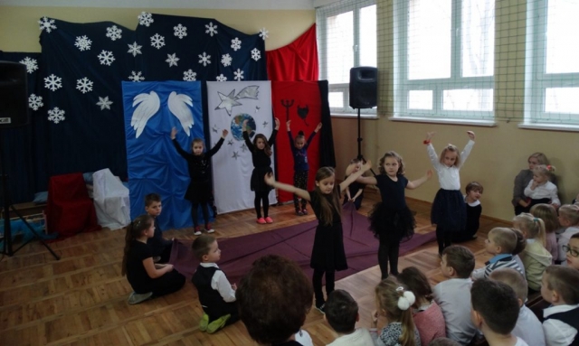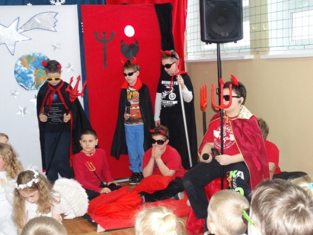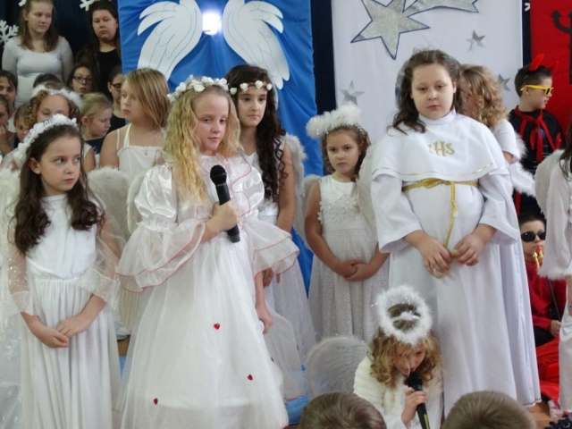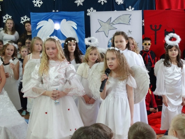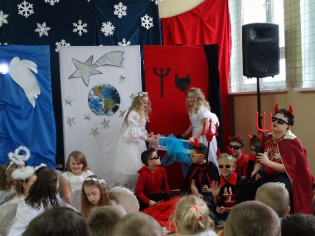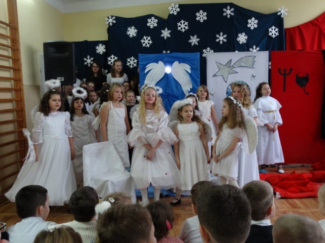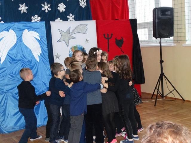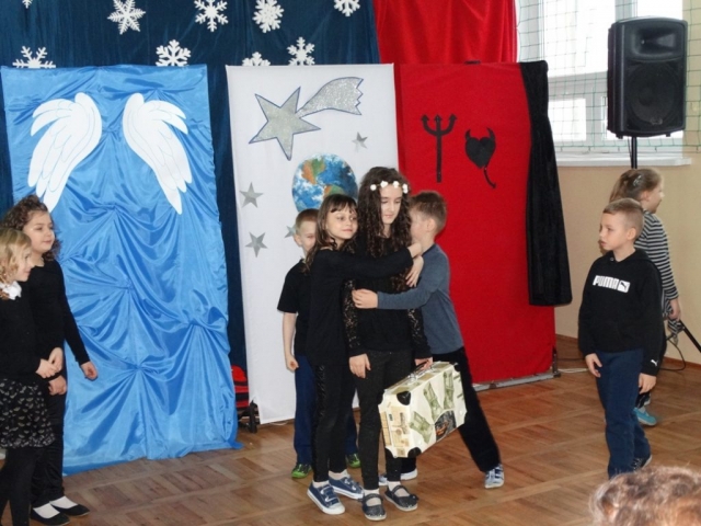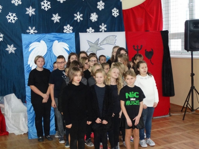 Ostatnim punktem programu była jasełka bożonarodzeniową w reżyserii Beaty Słowińskiej i Moniki Rochnowskiej pt. ,,Piekło i niebo – sztuka w 3 aktach”, w wykonaniu uczniów klasy III – IV. Oprawę muzyczną przygotował pan Dariusz Puciński, nauczyciel muzyki. Przedstawienie rozpoczął narrator słowami: