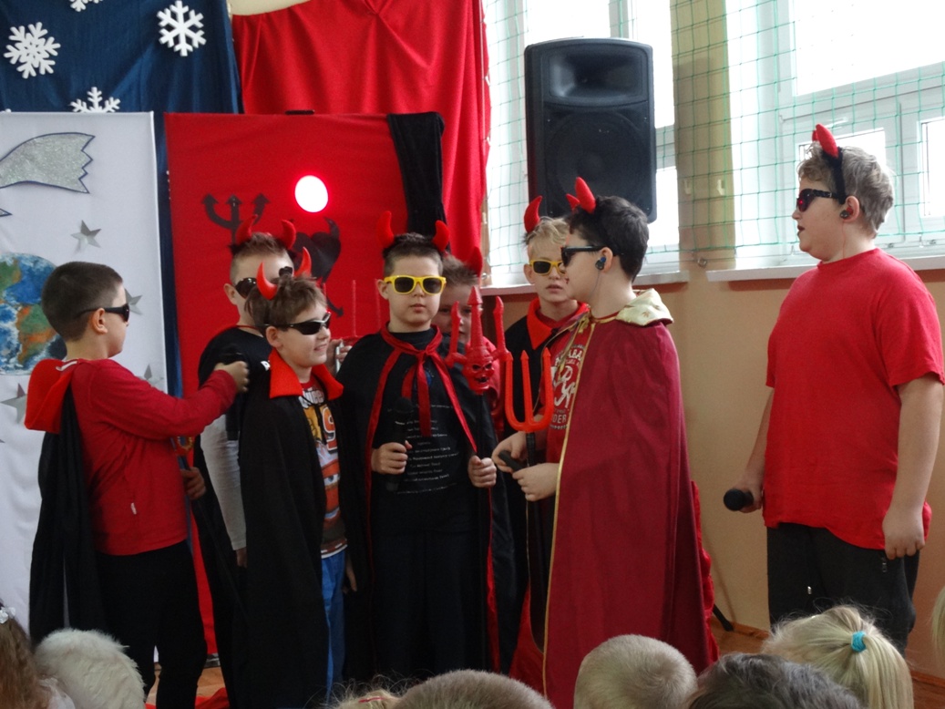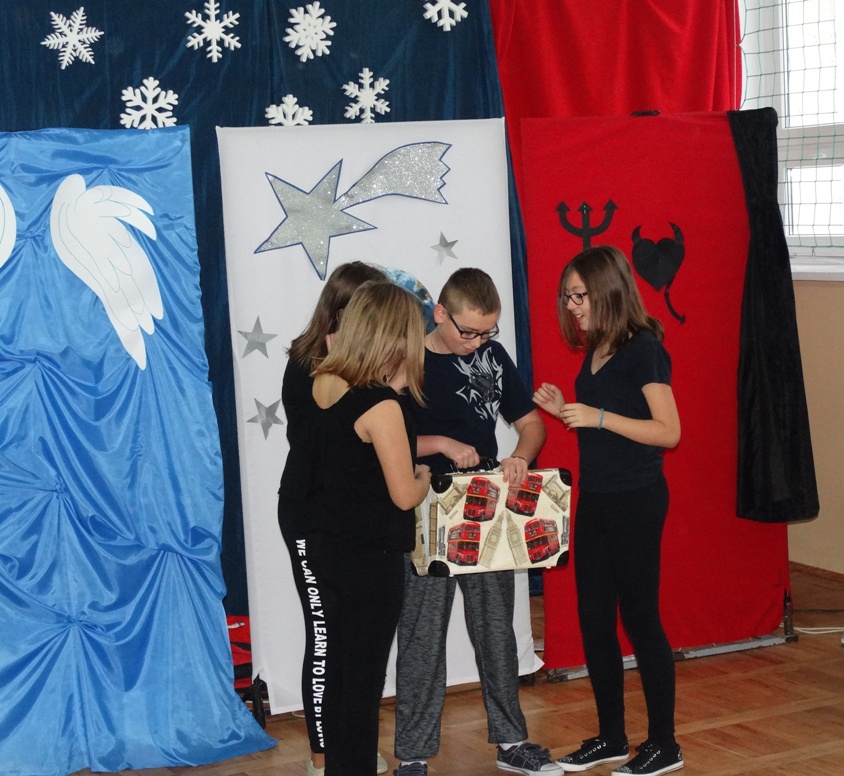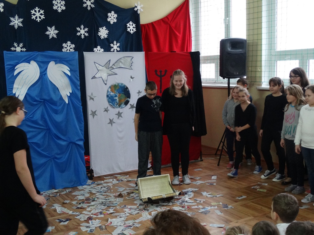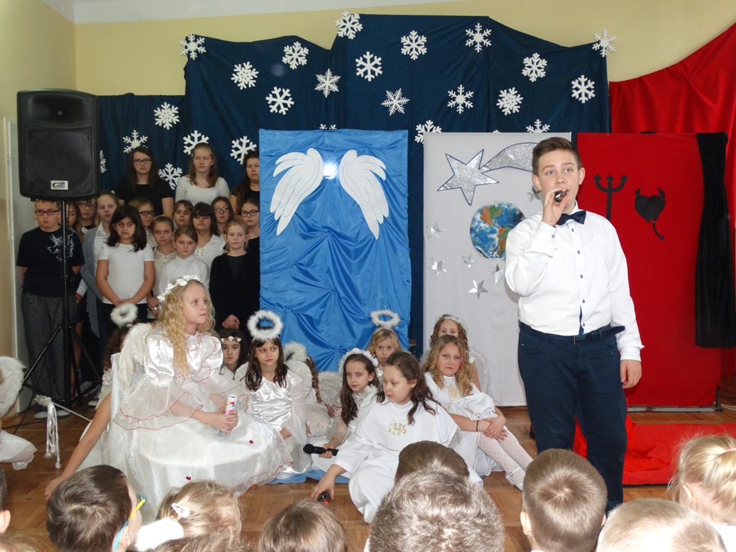 Ostatnim punktem programu była jasełka bożonarodzeniową w reżyserii Beaty Słowińskiej i Moniki Rochnowskiej pt. ,,Piekło i niebo – sztuka w 3 aktach”, w wykonaniu uczniów klasy III – IV. Oprawę muzyczną przygotował pan Dariusz Puciński, nauczyciel muzyki. Przedstawienie rozpoczął narrator słowami: