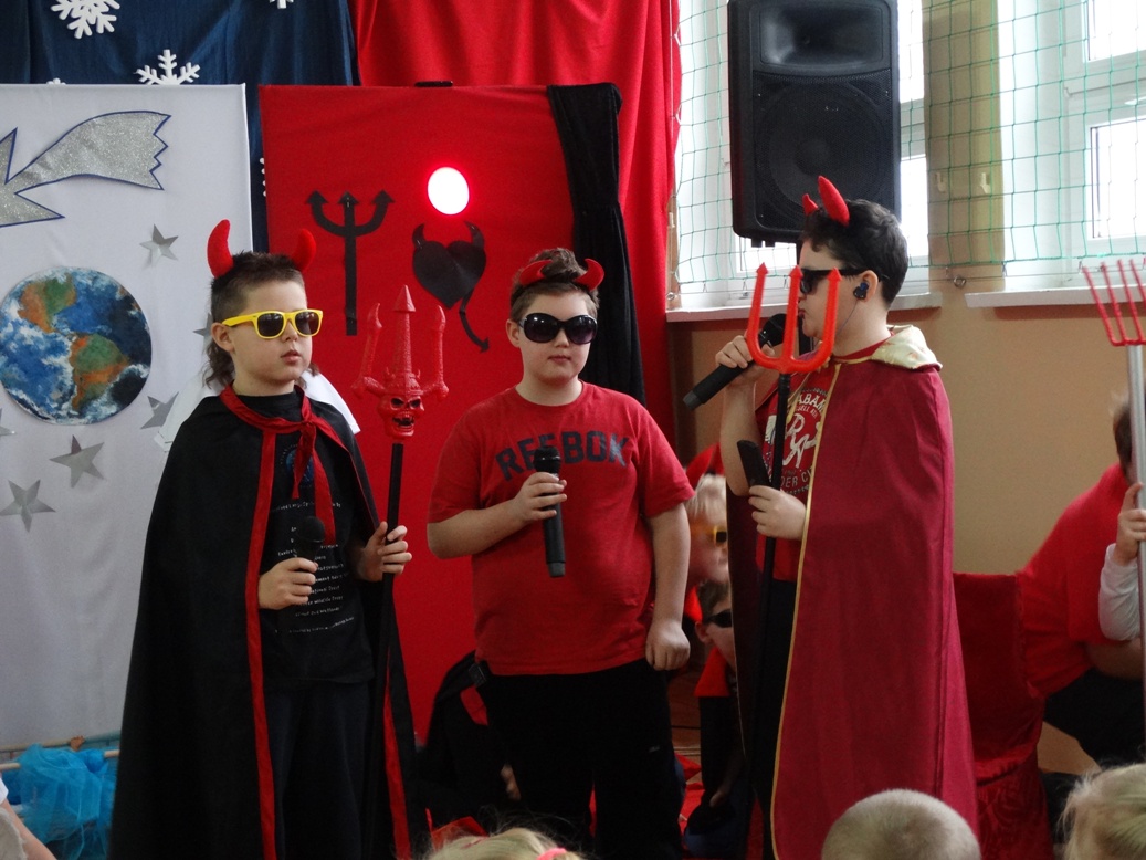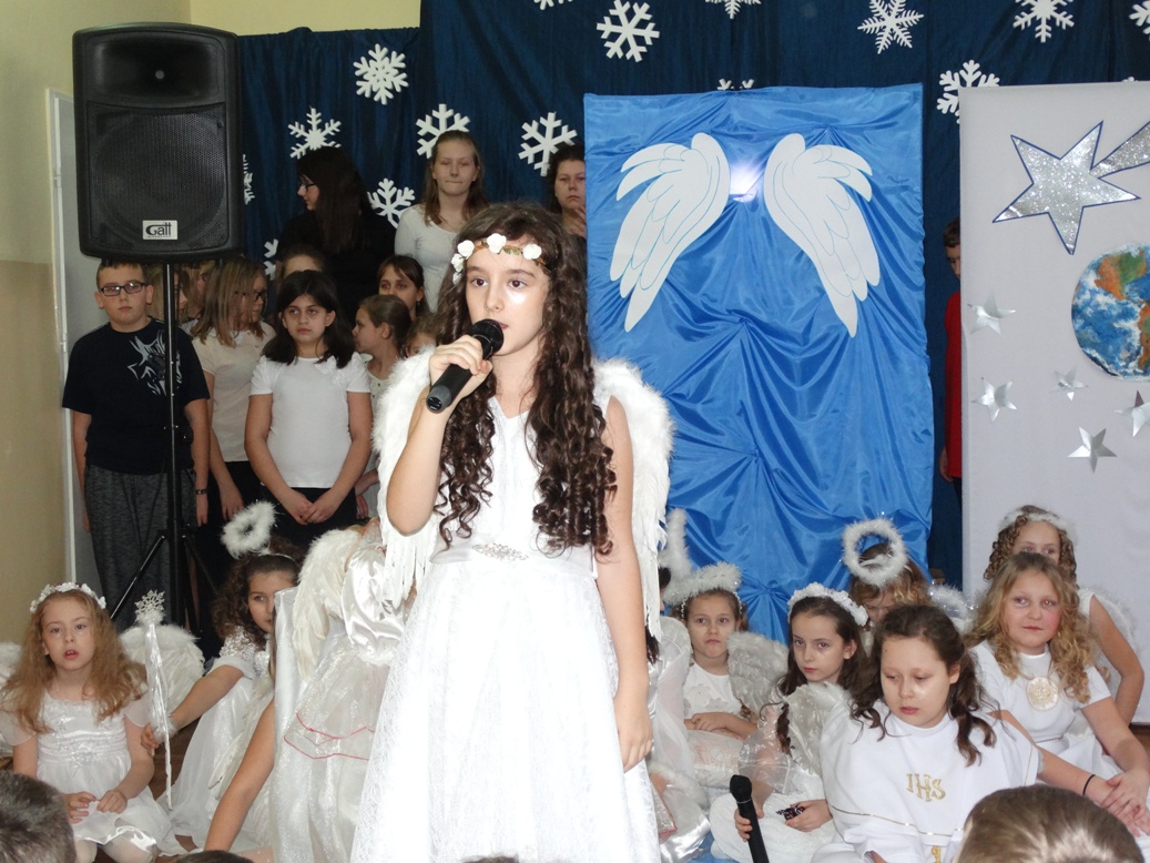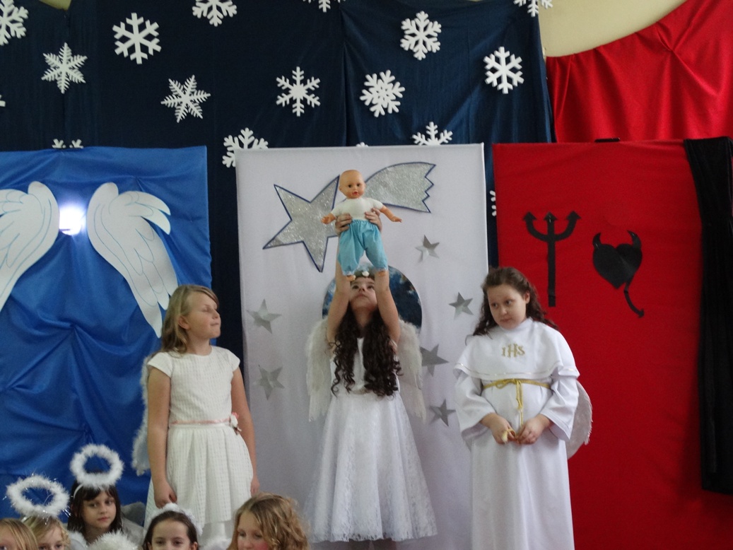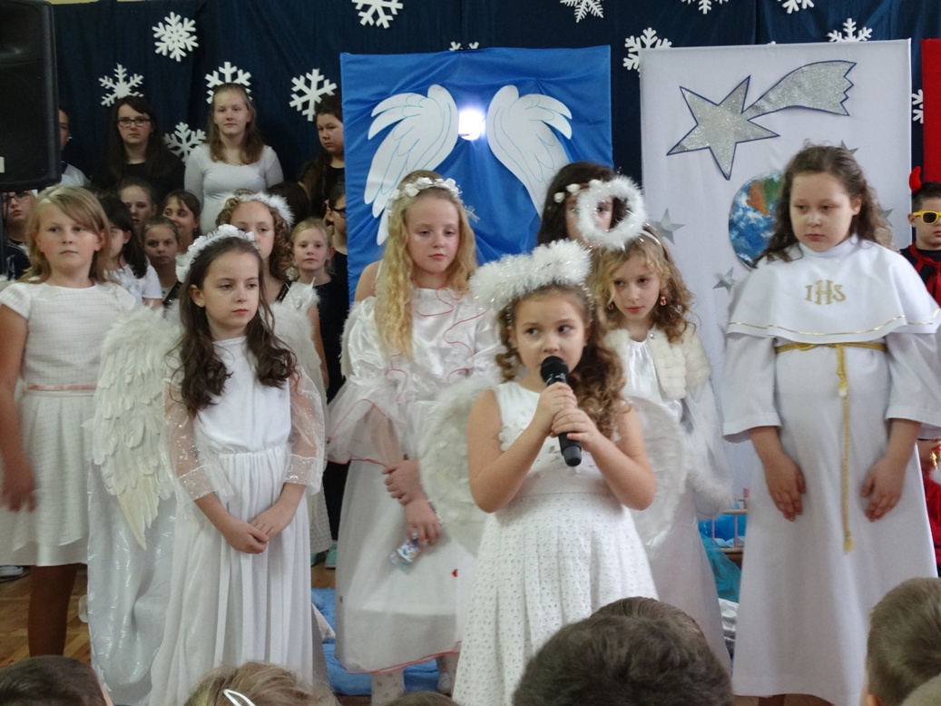 Ostatnim punktem programu była jasełka bożonarodzeniową w reżyserii Beaty Słowińskiej i Moniki Rochnowskiej pt. ,,Piekło i niebo – sztuka w 3 aktach”, w wykonaniu uczniów klasy III – IV. Oprawę muzyczną przygotował pan Dariusz Puciński, nauczyciel muzyki. Przedstawienie rozpoczął narrator słowami: