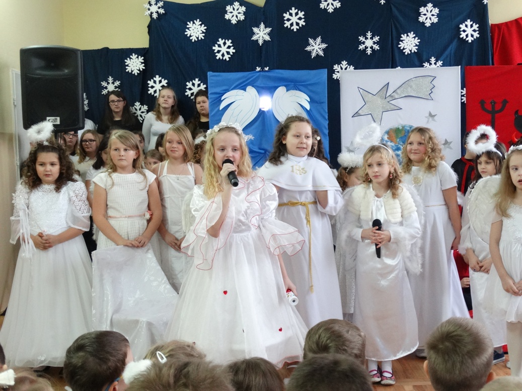 Święta Bożego Narodzenia to czas szczególny, chociaż codziennie dzieje się krzywda, giną niewinni ludzie, rodzi się przemoc i nienawiść. Świat codziennie dostarcza kolejnych słów na sensacyjne nagłówki gazet. Czy Bożonarodzeniowy Duch Świąt jest dzisiaj zupełnie bezsilny? Na to pytanie próbowano znaleźć odpowiedź podczas spotkania wigilijnego, które odbyło się w naszej szkole 20 grudnia. Spotkanie niezwykle bogate w doznania artystyczne, ponieważ pokazano trzy programy, w których mogli zaprezentować się uczniowie.
