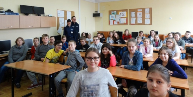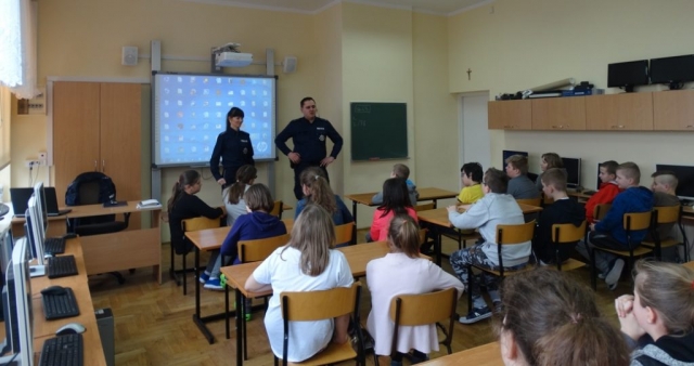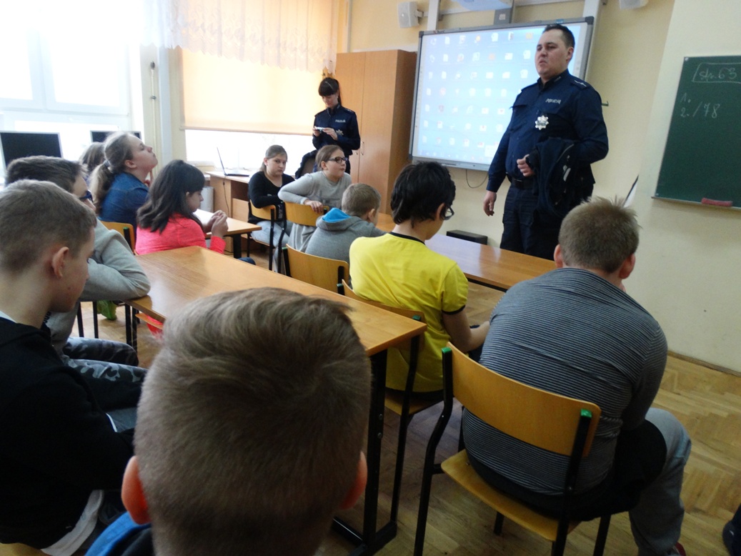 W ramach współpracy z Komendą Powiatową Policji w Rypinie najstarsi uczniowie naszej szkoły wzięli udział w spotkaniu z policjantami – asp. Dorotą Rupińską  i mł. asp. Mariuszem Dąbrowskim.Tematem spotkania była cyberprzemoc i ogólnie pojęte bezpieczeństwo w sieci. Nasi goście scharakteryzowali zjawisko cyberprzemocy, które na pozór niewinne, może wyrządzić ogromne szkody. Prowadzący spotkanie przypomnieli także o tym, że nikt w sieci nie jest anonimowy, zatem nie wolno nikogo obrażać, ośmieszać, poniżać, grozić komuś, umieszczać w Internecie zdjęć innej osoby bez jej zgody. Warto wiedzieć, że konto na portalach społecznościowych może mieć osoba, która ukończyła trzynaście lat, a cyberprzemoc jest karalna. Ten ważny i bardzo aktualny temat został przedstawiony w  atrakcyjny, a przede wszystkim, zrozumiały  sposób.