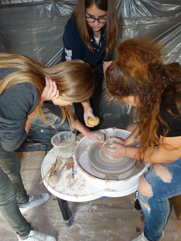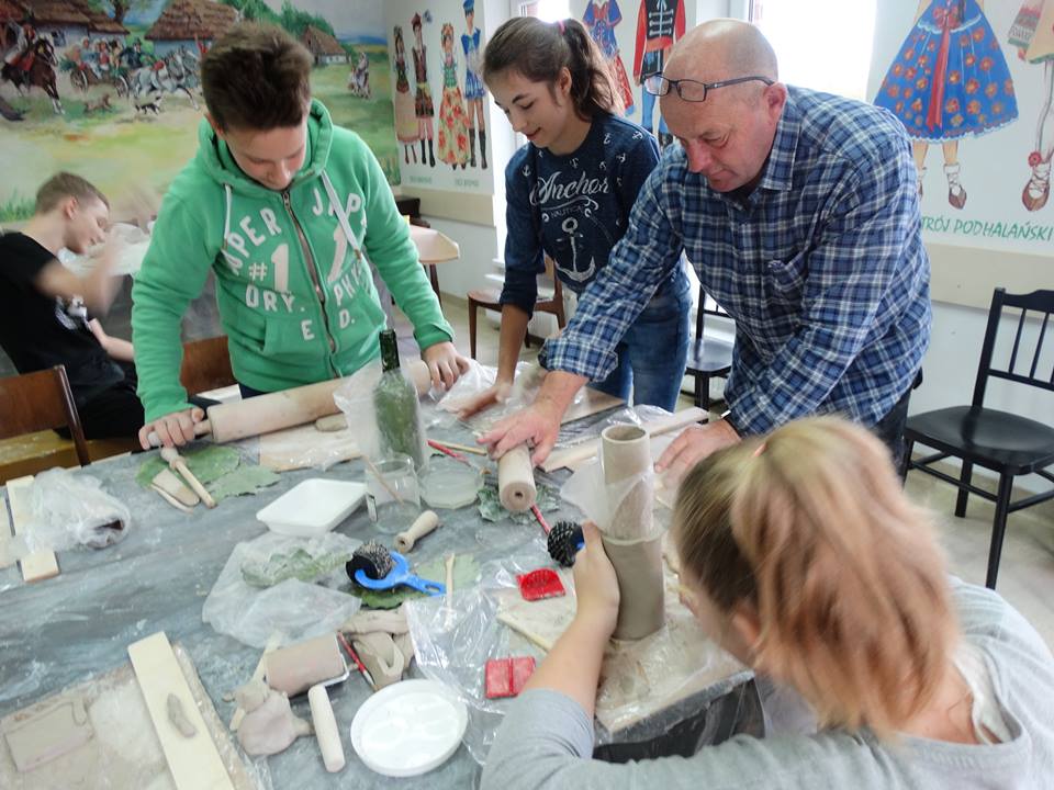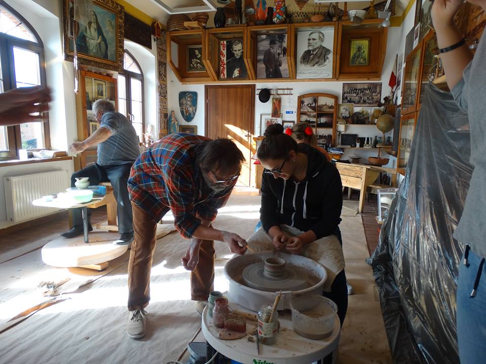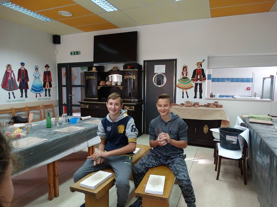 Pierwszym punktem programu było krótkie zwiedzanie obiektu, następnie przeszliśmy do sali głównej. Obejrzeliśmy tam filmy instruktażowe, omówiliśmy techniki garncarskie oraz zasady bezpiecznej pracy z gliną. Następnie zostaliśmy podzieleni na dwie grupy. Pierwsza grupa pracowała z instruktorem na kołach garncarskich. Druga grupa w tym samym ręcznie tworzyła wyroby z gliny. Następnie zmieniliśmy się, by każdy z nas miał szansę na zdobycie doświadczenia w obu technikach. Wszystkie nasze małe dzieła, które powstały w pracowniach, będą ozdabiane na kolejnym spotkaniu 16 listopada.