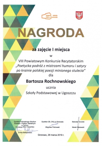 W POETYCKĄ PODRÓŻ WRAZ Z MISTRZAMI HUMORU I SATYRY PO KRAINIE POEZJI POLSKIEJ MINIONEGO STULECIA wyruszył Bartek Rochnowski w ramach VIII Powiatowego Konkursu Recytatorskiego, który odbył się 29 marca w Zespole Szkół, CKU w Gronowie. Celem tegorocznej edycji było zwrócenie uwagi młodych recytatorów na obecność humoru i satyry w wierszach poetów tworzących od 1918 roku po czasy współczesne. Jury oceniało m.in. dykcję, emisję głosu oraz ogólny wyraz artystyczny, czyli wyrazistość, emocje i uczucia. Bartek sięgnął do twórczości Wojciecha Młynarskiego i wywalczył I miejsce! Gratulujemy kolejnego sukcesu, potwierdzającego talenty artystyczne naszego ósmoklasisty. 🙂